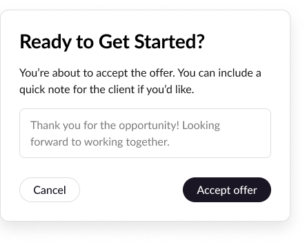 - A confirmation pop-up will appear where you can add a quick note to the client, such as “Thank you for the opportunity! Looking forward to working together.”