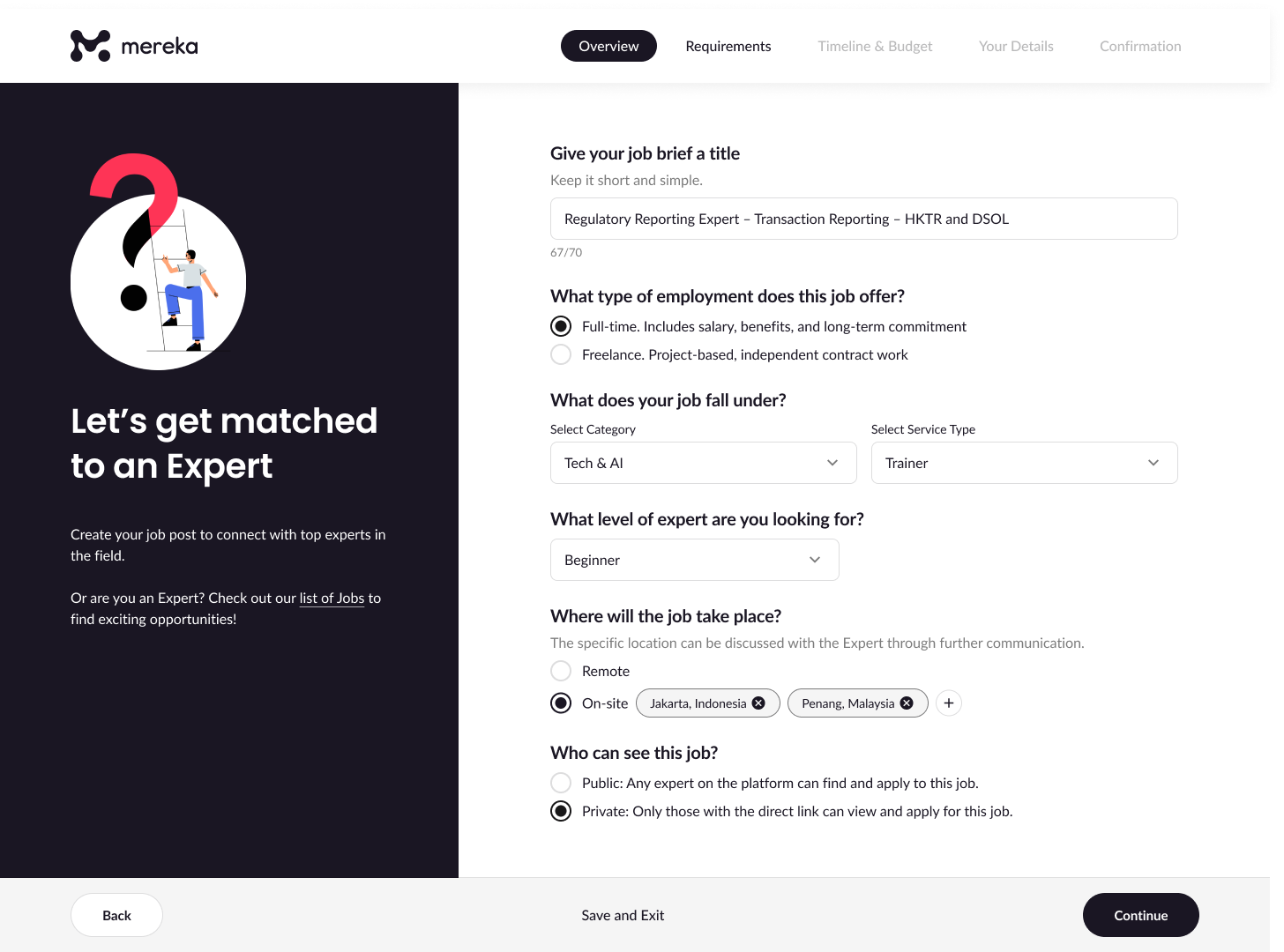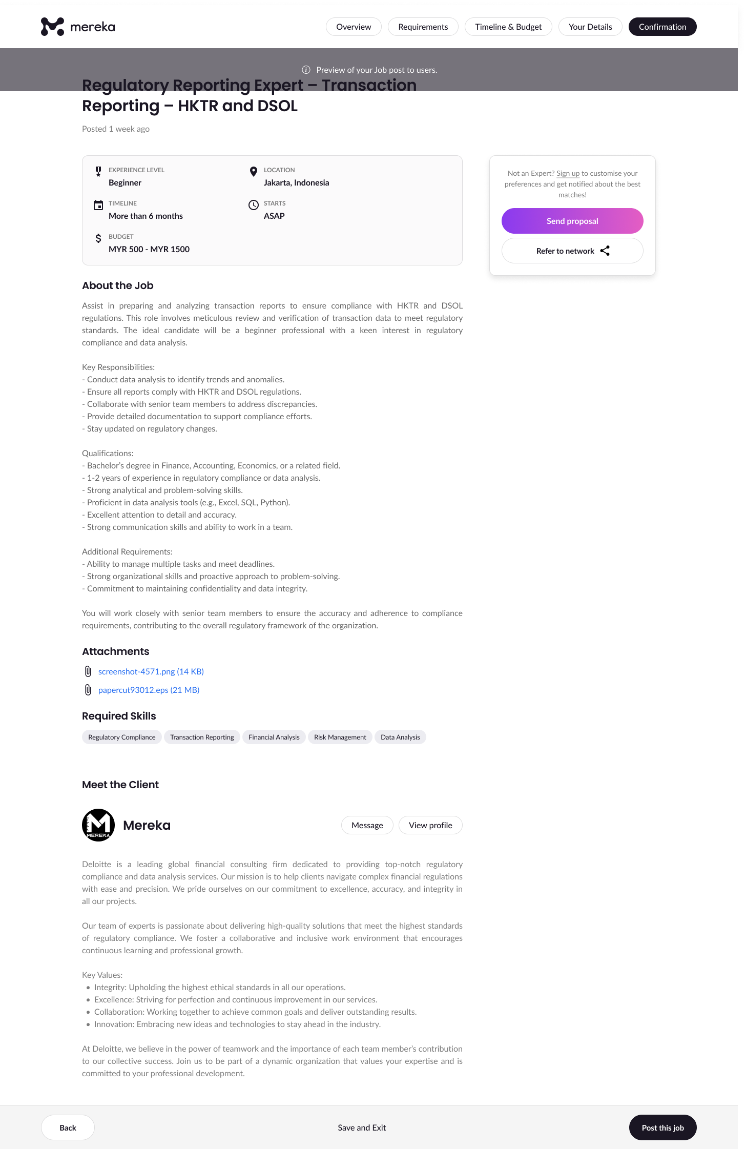 Creating an effective job post is the first step to finding the right talent for your project. Whether you’re looking for a regulatory expert or a digital marketing strategist, a well-crafted job post can help you attract highly qualified candidates. Here’s a step-by-step guide to walk you through the process on the Mereka platform, along with key tips and visuals to help you get it right.