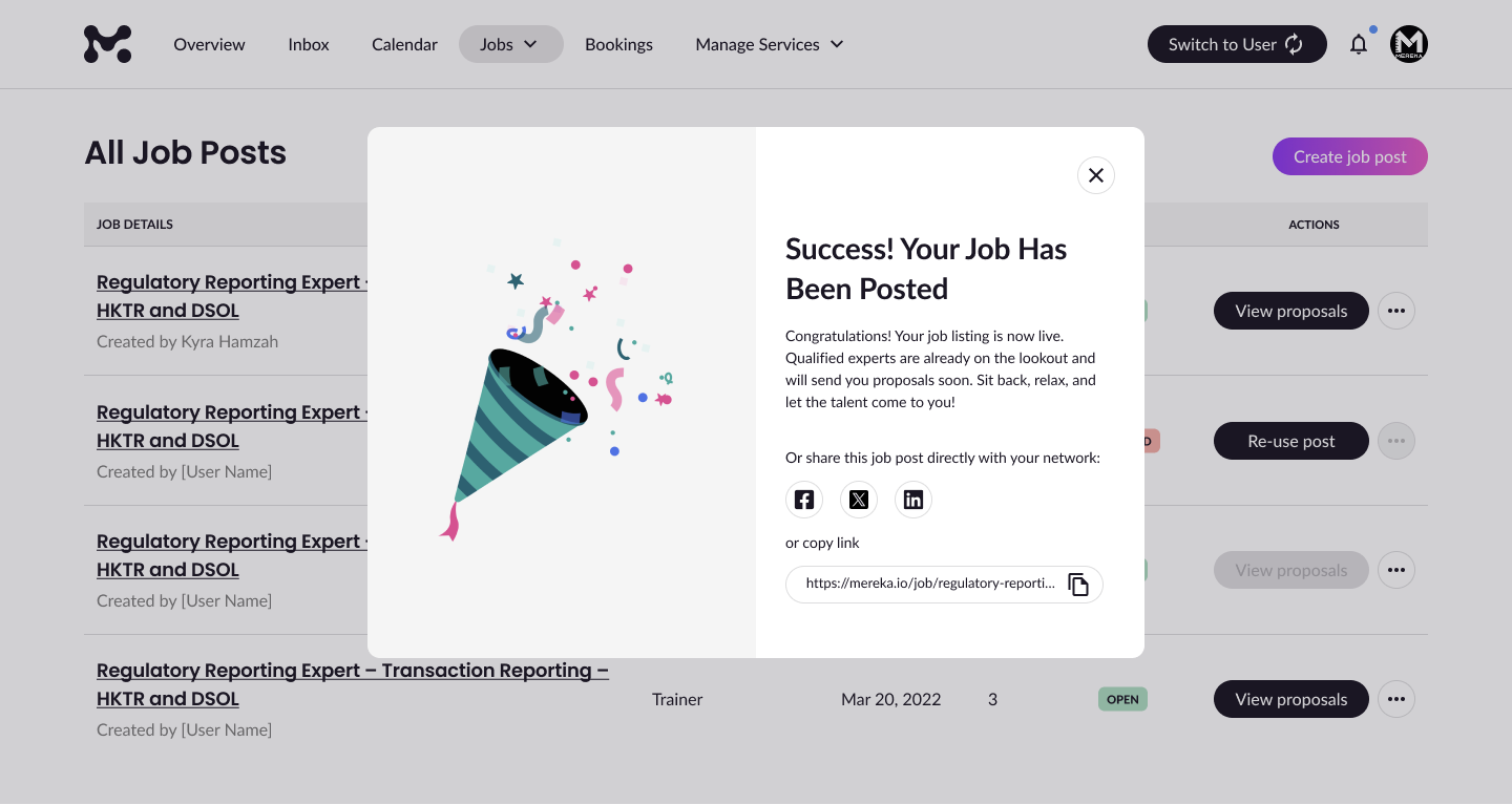 Once you’ve confirmed your job post, you’ll see a success screen letting you know your listing has been published. From here, you can sit back while qualified experts start submitting proposals. You’ll also have the option to instantly share your job via Facebook, X, LinkedIn, or by copying the job link directly—perfect for spreading the word to your network.