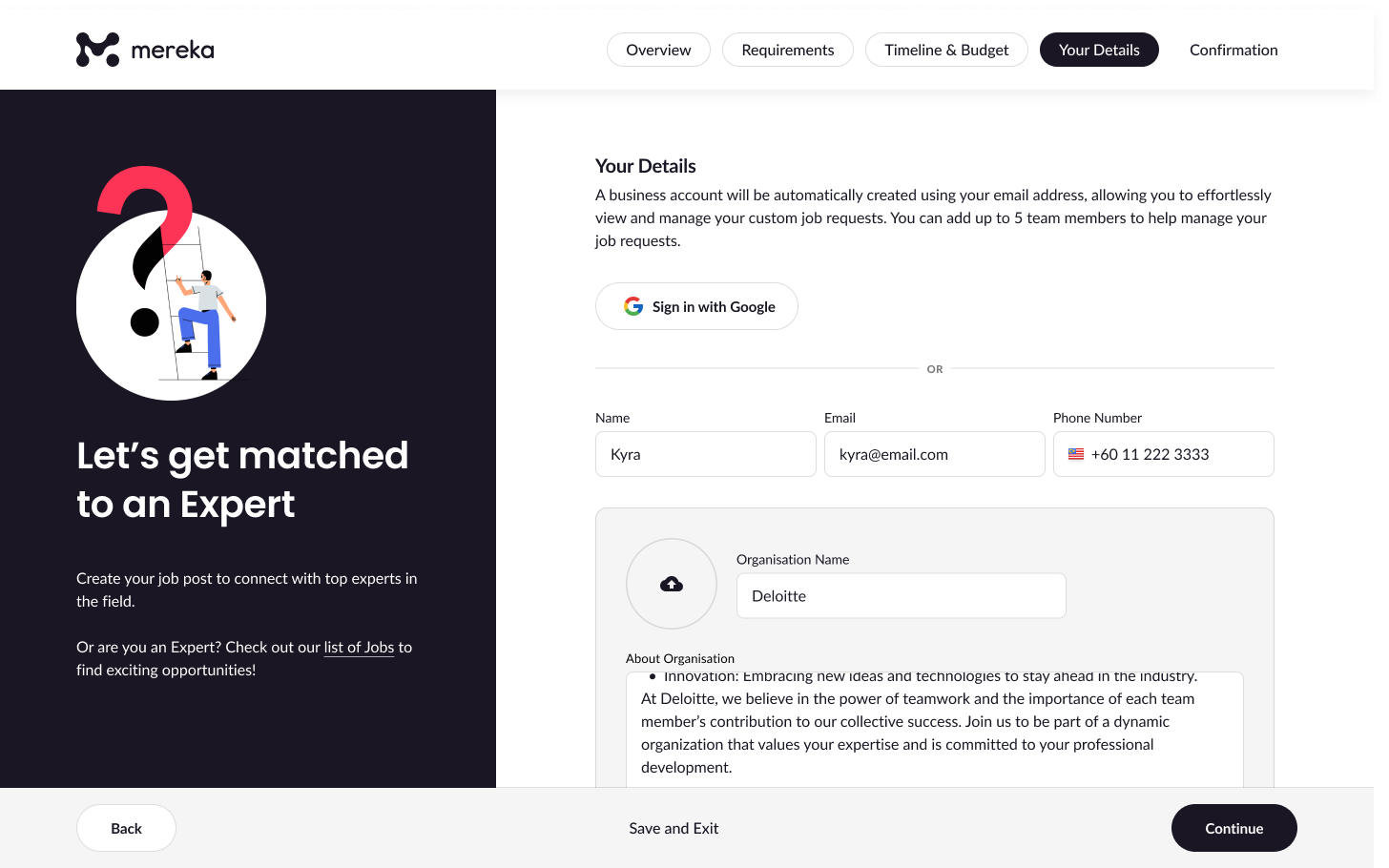 Enter your name, email, phone number, and a short summary about your organisation. This builds credibility and helps experts understand your organisation’s culture and values.