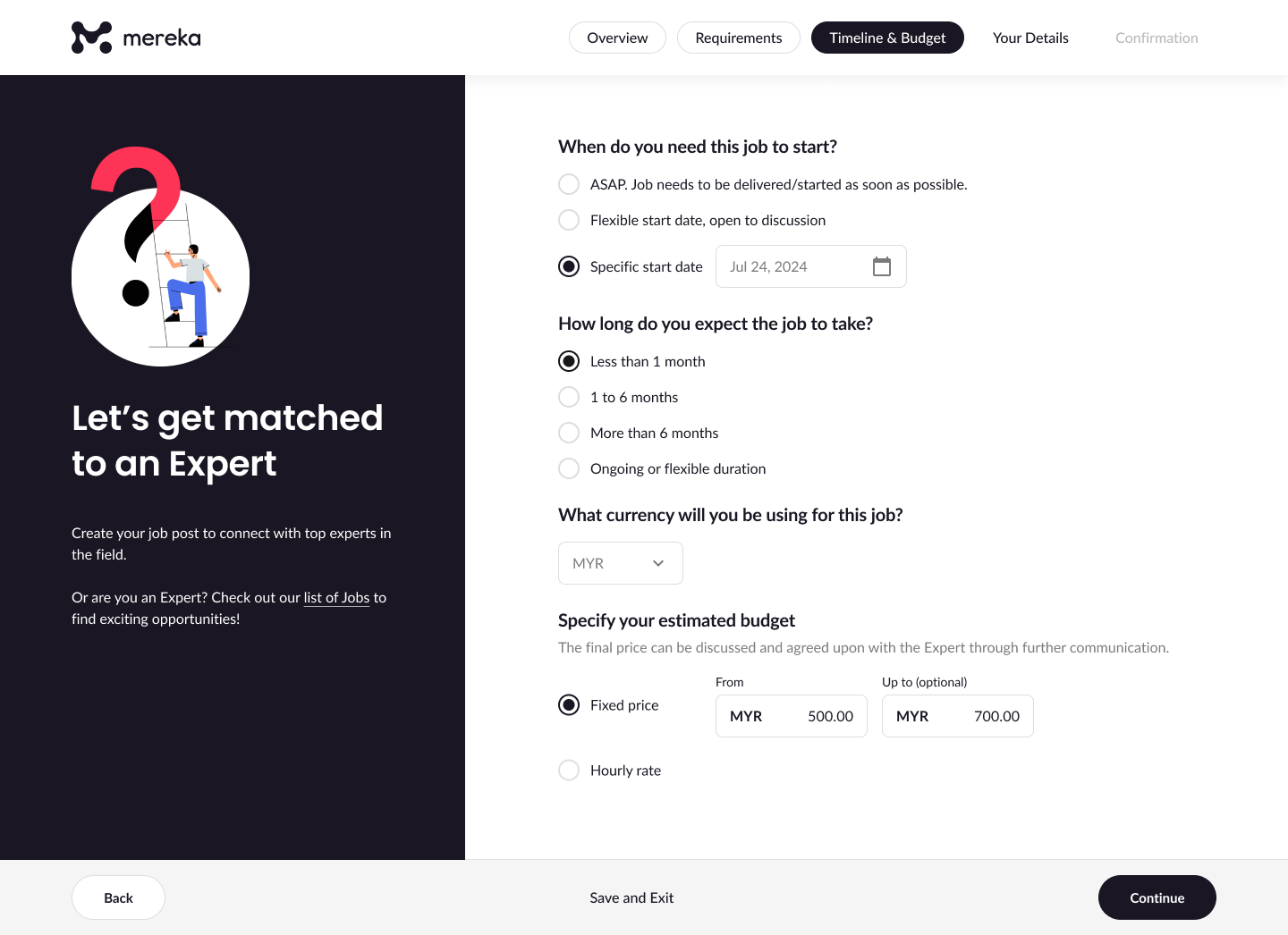 Choose when you want the job to start—immediately, on a specific date, or a flexible start. Then, estimate how long the project will take, whether under a month or more long-term. Set your budget using either a fixed price or an hourly rate.