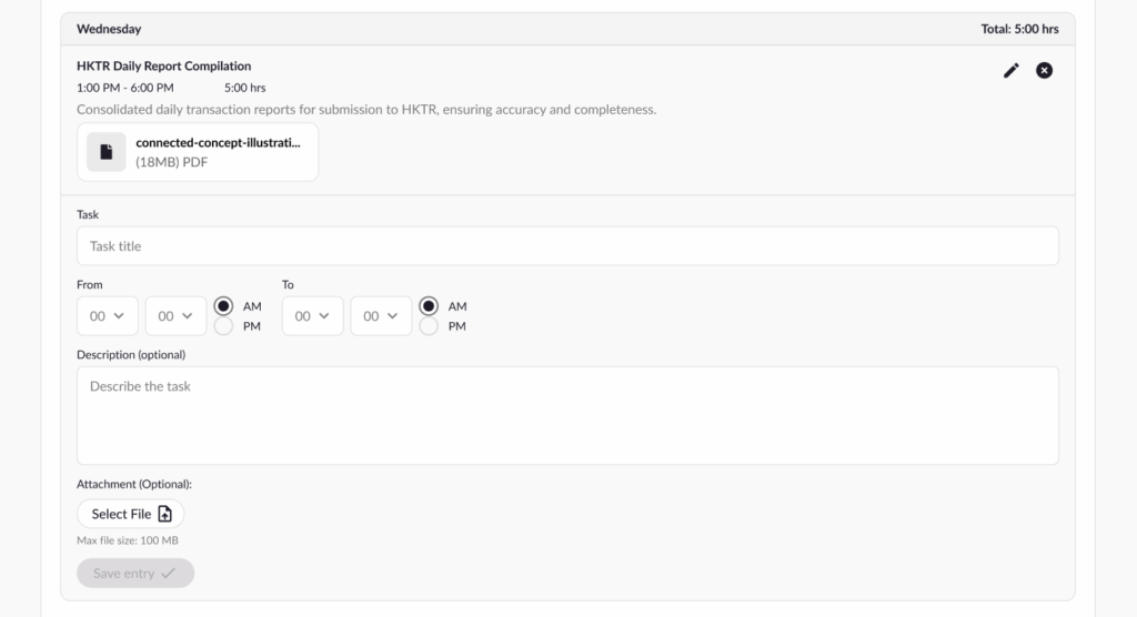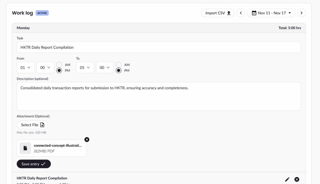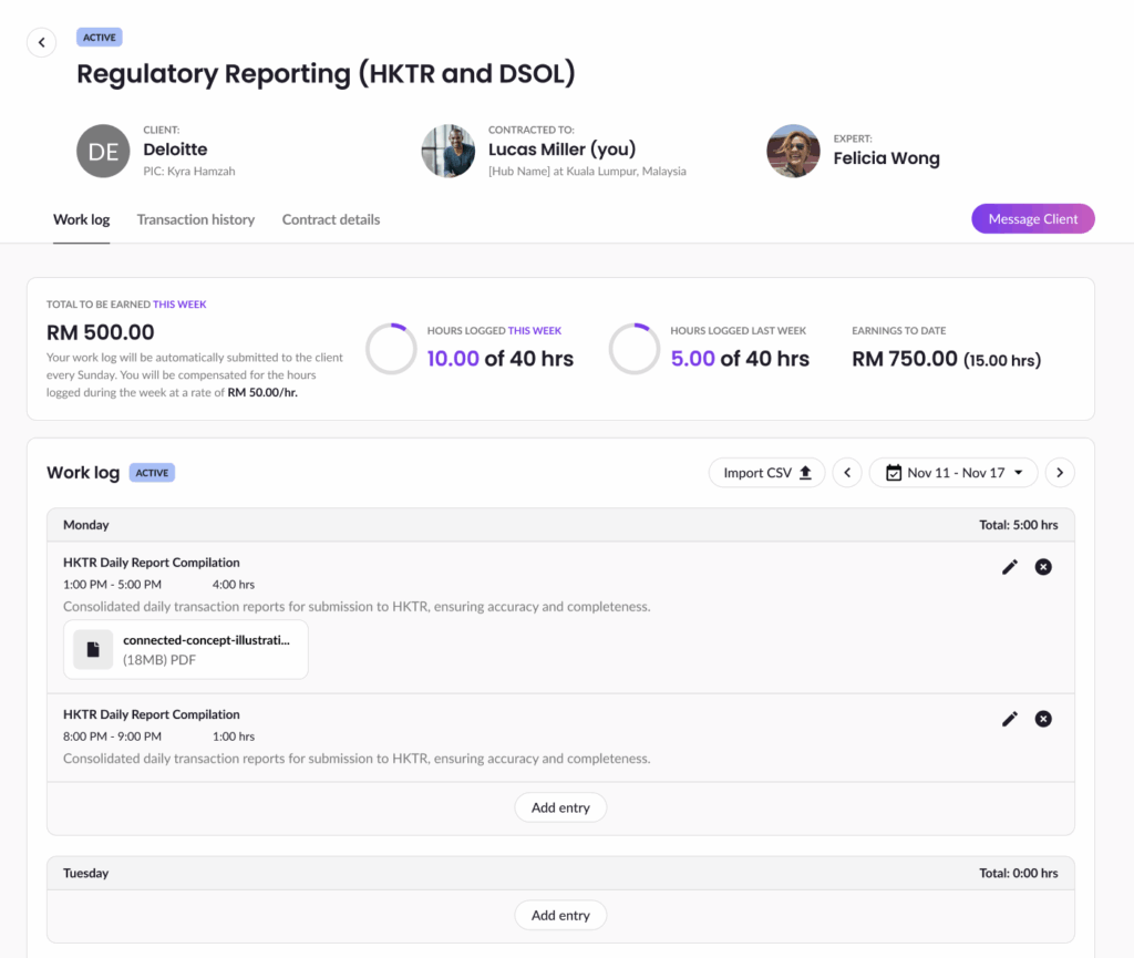You can log your working hours daily using the Work Log section on the Contract Details page.