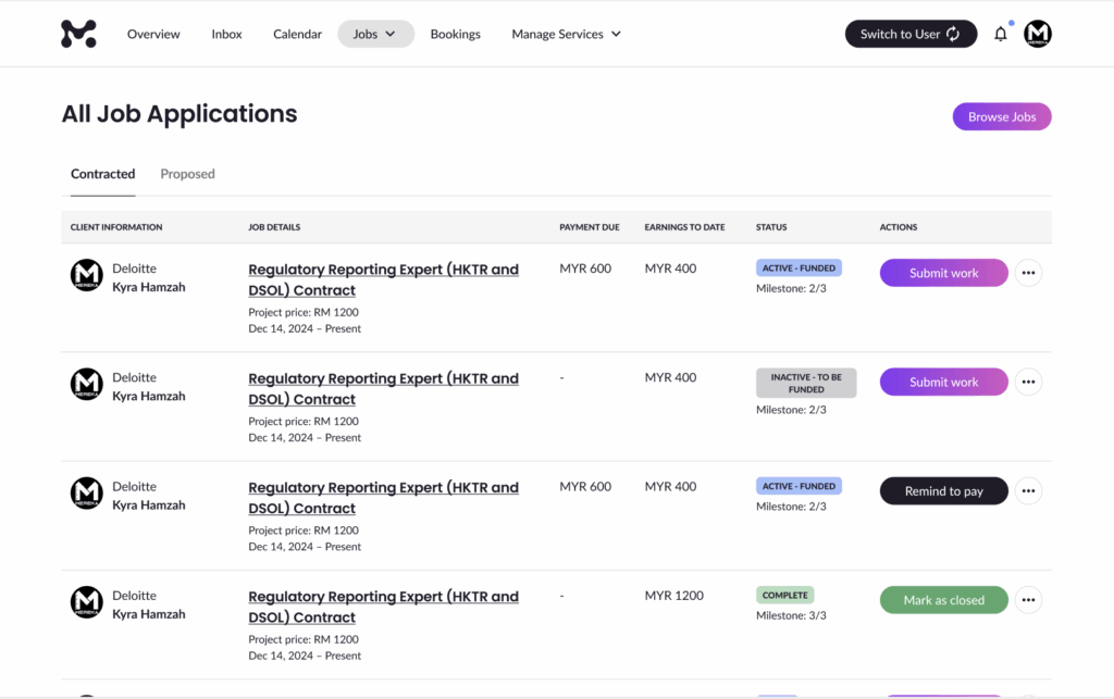 | Inactive – To Be Funded | Waiting for the next milestone to be funded | Remind to Pay, Message, View Contract |