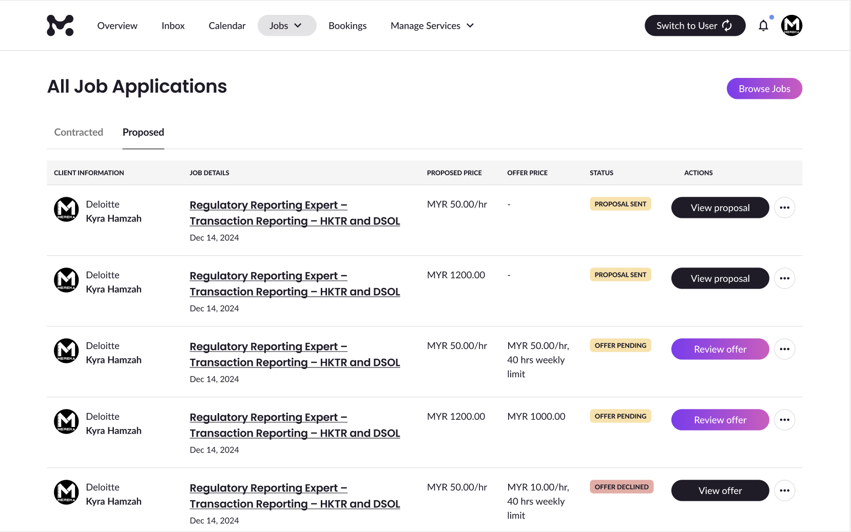| Proposal Sent | You’ve applied, but no offer yet. | View Proposal, Message, View Profile, Withdraw |